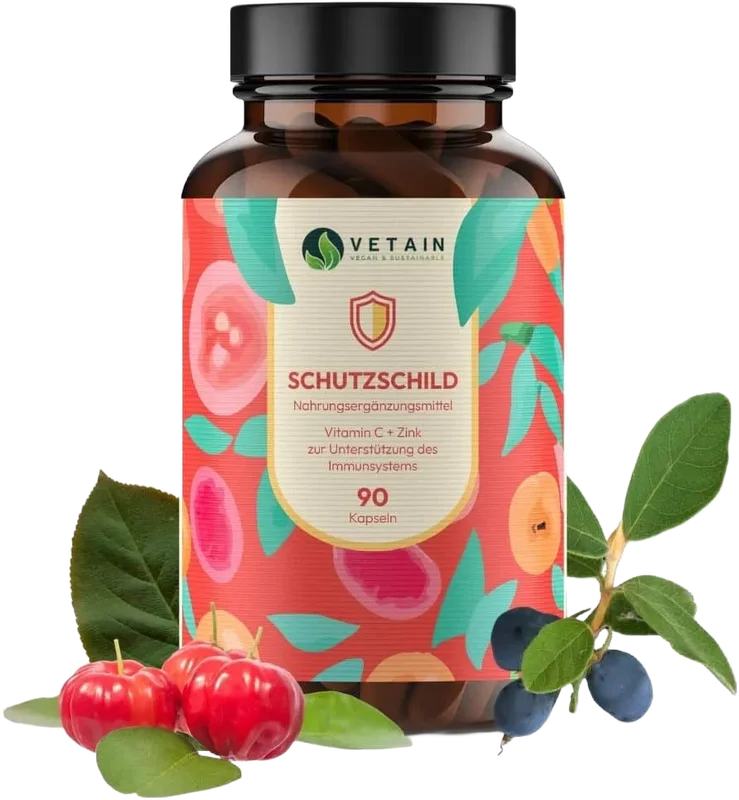 Alle Informationen zu Vetain Schutzschild Immun Komplex Kapseln mit Vitamin C & Zink Bakterien und Viren lauern überall, und Erkältungen sind echt lästig, stimmt’s? Unser Vitamin C & Zink-Komplex unterstützt die normale Funktion deines Immunsystems, damit du Dich gegen die fiesen Erreger zur Wehr setzen kannst.Wirkung:Vitamin C & Zink trägt zu einer normalen Funktion des Immunsystems (körperliche Abwehr) beiVitamin C trägt zur Verringerung von Müdigkeit und Ermüdung beiVitamin C trägt zu einem normalen Energiestoffwechsel beiNatürliche PowerStärke Dein Immunsystem mit pflanzlichen Inhaltsstoffen.Unser Schutzschild enthält viele natürliche Pflanzenextrakte wie Acerolapulver, GuaZinc® Guaven Blätter Extrakt und Haskap-Beerenpulver.Diese Kombination aus Vitamin C und Zink unterstützt dein Immunsystem, schützt die Zellen vor oxidativem Stress und trägt zur Verringerung von Müdigkeit bei. Profitiere von den vielen positiven Effekten des Immun-Komplexes auf deinen Körper.Vegan, allergenfrei und ohne künstliche ZusätzeWir achten darauf, dass unsere Produkte rein vegan und ohne unnötige Zusätze sind.Unser Vitamin C & Zink Komplex ist allergenfrei und enthält keine künstlichen Zusatzstoffe.Gönn Deinem Körper etwas Gutes und setze auf eine natürliche und verantwortungsbewusste Ernährung.