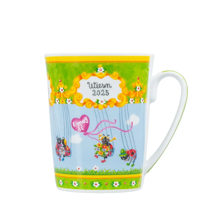 Einsteigen, festhalten und genießen – dieses zauberhafte Wiesn Haferl nimmt Sie mit auf eine luftige Karussellfahrt voller Emotionen und liebevoller Details. Im Mittelpunkt stehen fröhliche kleine Käferchen, die mit Tuba, Wiesn-Herz, Luftballon oder als verliebtes Pärchen die Welt ein Stückchen bunter machen. Das Motiv erzählt von Unbeschwertheit, Gemeinschaft und der besonderen Magie der Wiesn, eingefangen in einem fröhlichen Karussell, das sich genauso dreht wie das bunte Treiben auf der Theresienwiese. Dank seiner frischen Gestaltung ist dieses Haferl ein echter Blickfang – ob am Frühstückstisch, im Büro oder als charmantes Sammlerstück. Jedes Käferchen hat seine eigene kleine Geschichte, die zum Schmunzeln, Erinnern und Verlieben einlädt.