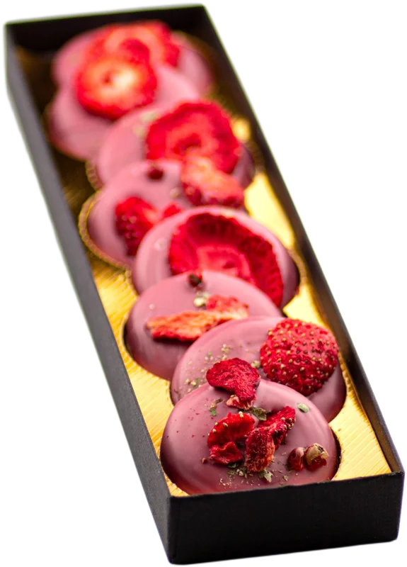 More information about Wild Ruby chocolate thaler 47% cocoa Fruity | SpicyType: Ruby chocolate8 hand-scooped Ruby chocolate coins (cocoa: 47% minimum) with dried strawberries and green pepper.Store in a dry place at 12°C – 20°C.
