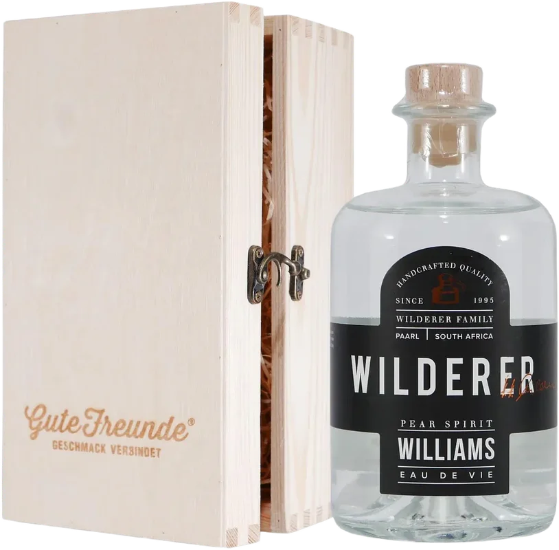 Alle Informationen zu WILDERER Williamsgeist mit Geschenk-Holzkiste Dieser delikate Geist aus Williams Birnen ist einer der beliebtesten Digestifs der Welt und hat das Aroma köstlich reifer Birnen in Nase und Gaumen.Es ist die perfekte Basis für die Kreation einzigartiger Cocktails, einfallsreicher fruchtiger Desserts oder um sie nach dem Abendessen zu genießen und in das köstlich volle, reife Birnenaroma einzutauchen. Auf den Flaschenetikett steht Eau de Vie – so bezeichnet man im Englischen einen Geist. Wenn es um Qualität geht, gibt es bei Wilderer keine Kompromisse. Mühevolle Kleinstarbeit, die sich auszahlt! Das Ergebnis: In Perfektion kreierte, aromatisch einzigartige Edelbrände mit reinem Charakter.Rechtlicher HinweisAb 18! Dieses Produkt enthält Alkohol und darf nicht an Personen unter dem gesetzlichen Mindestalter abgegeben werden. Eine Lieferung an Minderjährige ist nicht möglich. Mit deiner Bestellung bestätigen Sie, dass Sie das gesetzlich vorgeschriebene Mindestalter haben. Bitte seien Sie verantwortungsvoll im Umgang mit diesem Artikel. Weitere Informationen unter kenn-dein-limit.info. Es wird keine Gewähr dafür übernommen, dass der gelieferte Artikel vollkommen identisch mit dem auf dem Online-Angebot gezeigten Bild ist. Dies gilt in besonderem Maße für nummerierte Abfüllungen, Jahrgänge und für Änderungen von Flaschenausstattungen und Verpackungen, die einem lieferantenseitigen Wechsel unterworfen sind. Bei den Bildern handelt es sich um Beispielbilder, die wesentlichen Merkmale des Artikels befindet sich in der Artikelbeschreibung.Der Markenname ist Eigentum des Rechteinhabers. Die Verwendung des Markennamens dient hier lediglich der Indentifizierung der Ware sowie der Kennzeichnung der Qualität und soll keineswegs eine Schutzrechtsverletzung darstellen.Inverkehrbringer: Wilderer Distillery, Spice Route Wine Estate, Suid-Agter Paarl Road, Suider-Paarl, 7624, South Africa